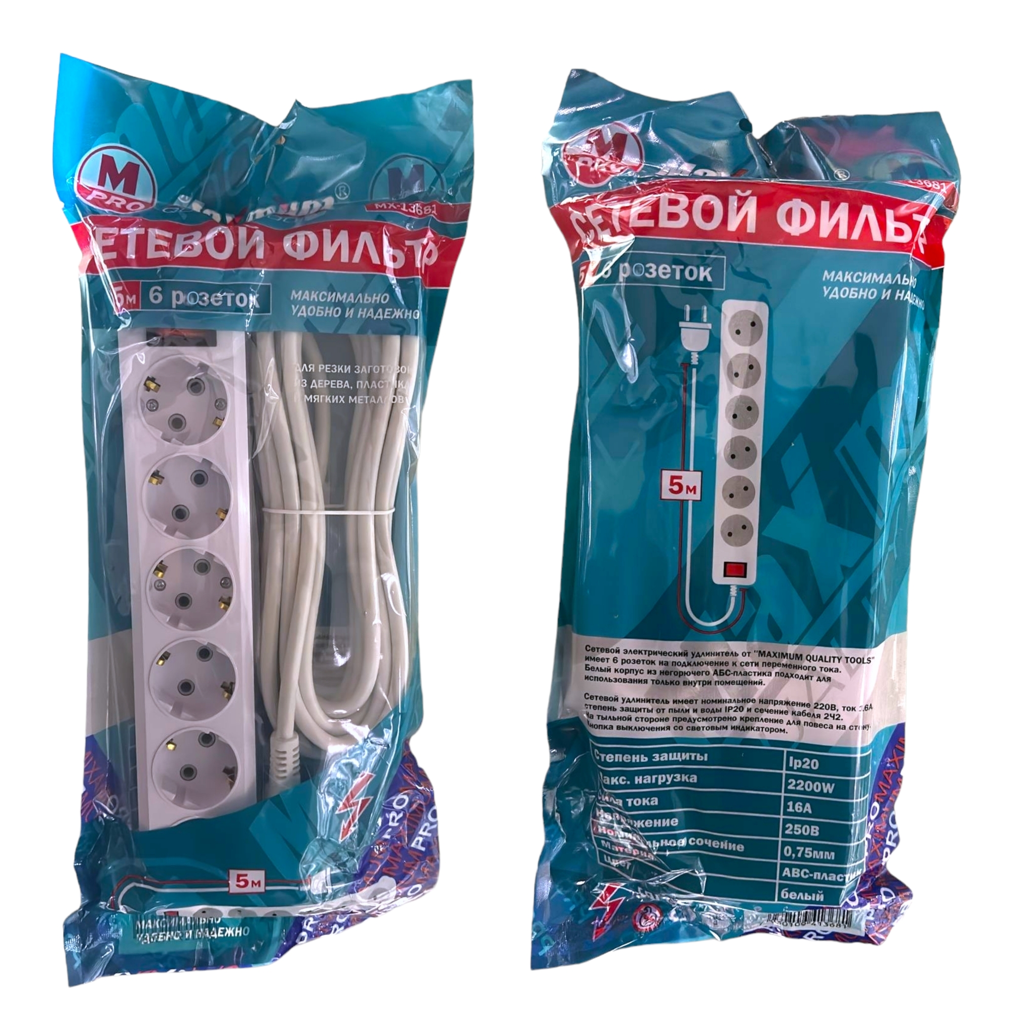 Сетевой фильтр 5 метров от "MAXIMUM QUALITY TOOLS" создан с 6 розетками и евровилкой. Корпус выполнен из белого негорючего АБС-пластика и подходит для использования только внутри помещений-степень влагозащиты IP 20. Розетки с заземлением расположены под углом 45 градусов.
